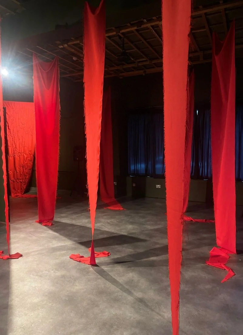 Mirroring this in their installation, Halligan and O’Neill-Nicholl represent these stages visually through the installation of eight ceiling to floor bright red flags. On one of the flags, words and phrases were stitched into the blood-coloured fabric, reflecting those that abusers and enablers implement to justify abuse: ‘she used to push my buttons’; ‘she used to make me jealous’; ‘I couldn’t help it.’ The artists do not accept these phrases as excuses, instead, aligning them with red flags – a rejection of the normalcy of violence.