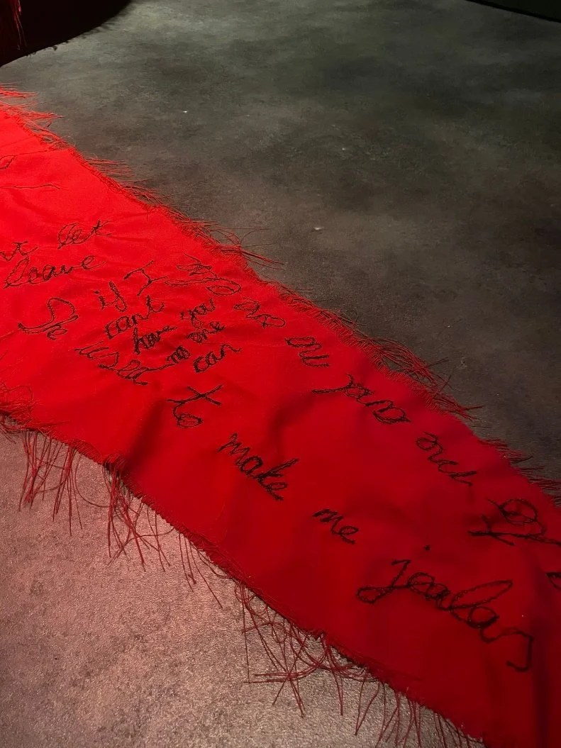Furthermore, these words set upon and within the blood red cloth instil a sense of correlation between the legitimation and perpetuation of these excuses with the blood of the women who have been murdered – words can kill.