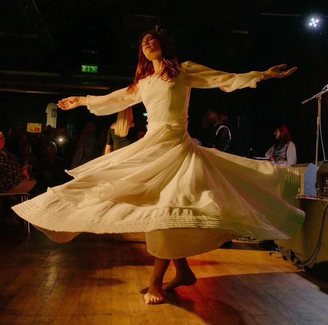 Anna is a captivating whirling dancer, born in London to an Irish mother and an Anatolian Alevi father. Her diverse cultural background seamlessly weaves into the rich tapestry of her artistry. Her lifework is not just showcases of skill and technique but profound explorations of the whirling dance's spiritual essence.
